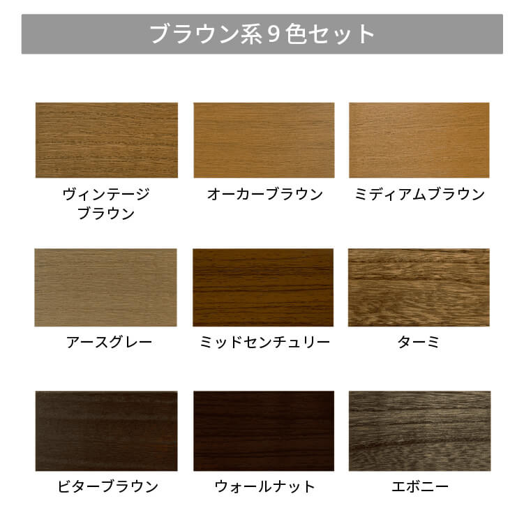 ヴィンテージブラウン、オーカーブラウン、ミディアムブラウン、ビターブラウン、アースグレー、ミッドセンチュリー、ウォールナット、ターミ、エボニー