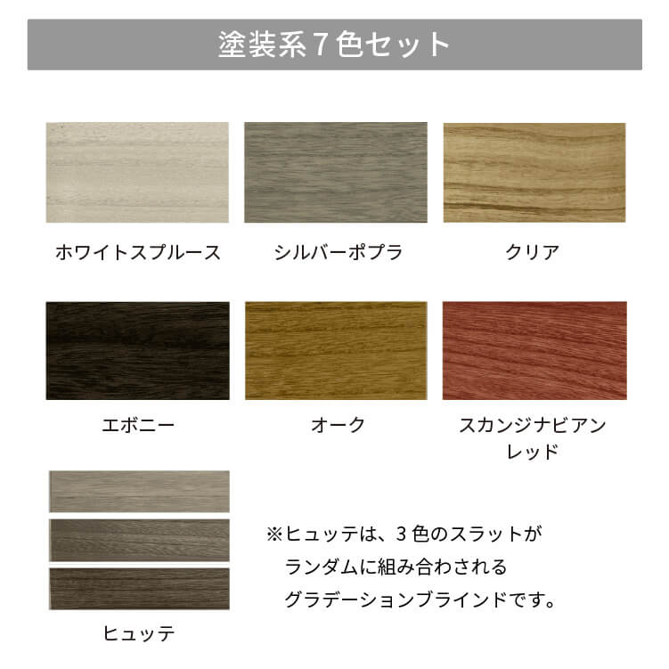 ホワイトスプルース、クリア、オーク、シルバーポプラ、エボニー、スカンジナビアンレッド、ヒュッテ