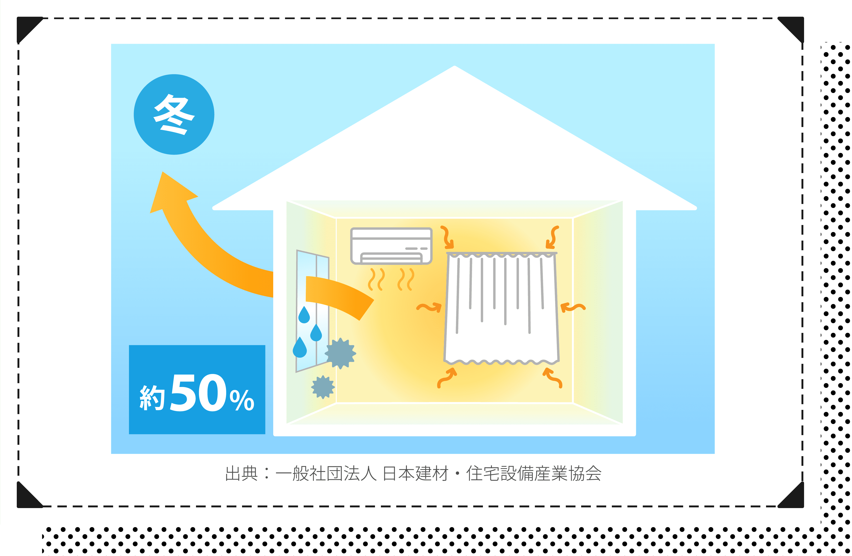 - ①お部屋の暖かい空気の流出を防ぎ快適な室温をキープ