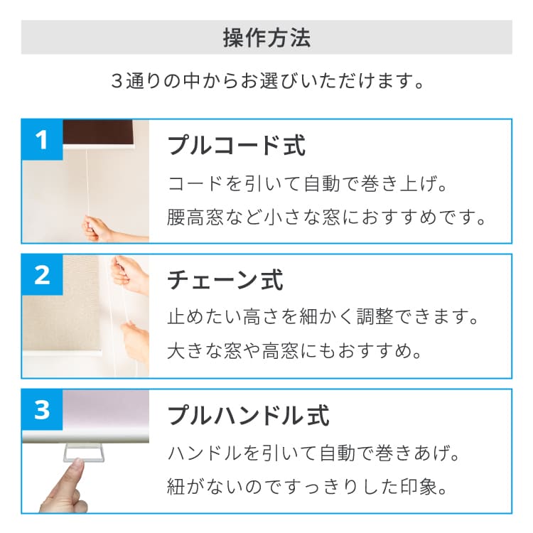 空間や窓にあわせて生地をお選びください。どの生地も日本の風土にあわせて「UVカット・断熱性」を備えているのでオールシーズン快適にご使用いただけます。